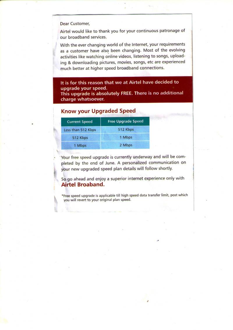 Initially I started my broadband plan from 256 kbps in 2009, in the month of February 2010 I changed my plan to 512 Kbps for 899 Rs. In the month of May 2010 I received a letter from Airtel stating they are upgrading my speed to 1 Mbps without any additional charges but this speed will be with limited data transfer of 20 GB per month. So as per their letter they upgraded my speed to 1 Mbps from the month of June and until August their was no problem.
