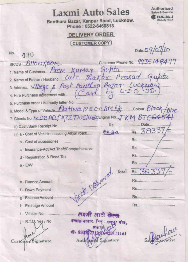 Maine 9 July, 2010 ko Baja Platina 125cc "LAXMI AUTO SALES, Banthara Bazar, Lucknow (U.P.) Contact No.********85" se kharidi thi (ye dealer PUSHPA AUTO SALES, ALAMBAGH, LUCKNOW SE ATTACH HAI) lekin abhi tak dealer ne muzhe bike ka Registration Certificate nahi diya hai. Roz koi na koi bahana batate hai. Aisa is agency me har customer ke saath kiya ja raha hai. Customer ka paisa rokkar agency owner usse apna business turn over kar raha hai. Customer ki problem se uska koi matlab nahi hai. Please is matter me action le aur dealer ko order kare ki wo mere documents jaldi se jaldi muzhe uplabdh karwaye.