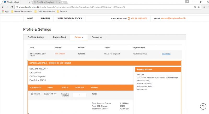 1. Order placed on the website on 20th March 2017, at 19:00 hrs.