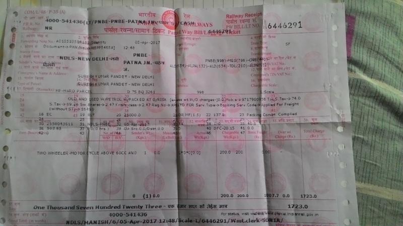 We booked one hero two wheeler bike by Indian railway parcel from New Delhi to Patna ,date of booking 05/04/2017 and with my journey ticket by Magadh express train no 12402 ,date 05/04/2017.