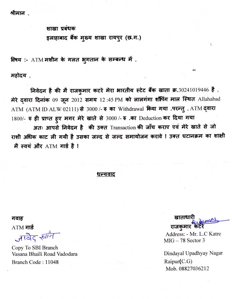 I am having Saving account with SBI Raipur which account number is 30241019446.On date 9th of Jun 2012 I put request for withdraw amount 3000/- but I got only 1800/- from Allahabad ATM[ATM ID ALW 02111].