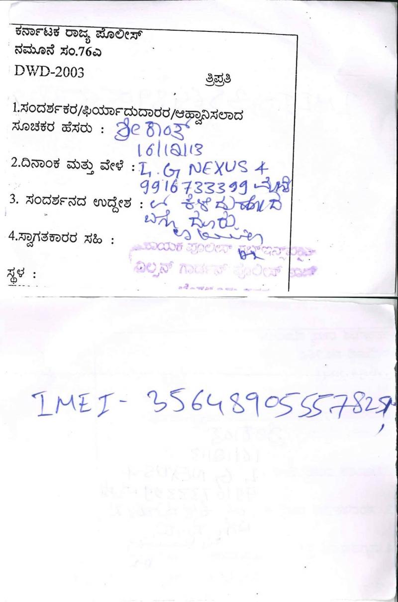 I have lost my phone (LG Nexus 4) on December 16th 2013, early morning at 5:30 AM in Shanthinagar Bus stand, Bangalore. I went to my home town during the weekend and just returned and got down from the bus. I was waiting for a bus to reach my home. There was a bus going towards Banashankari and I was about to get into the bus just then somebody snatched the phone. I realized it after I got into the bus. I immediately got off the bus and tried dialing my phone with my other mobile (office phone). I could not trace it. and lodged a complain immediately at wilson garden police station. The in-charge officers at the police station were least bothered to take the complaint. I had to visit the police station twice, same day once and the next day once again to lodge the complaint along with IMEI number. It has been 4 months since then and my mobile is still not traced. Kindly look into the phone theft matter in the whole city very seriously and put an end to this menace.