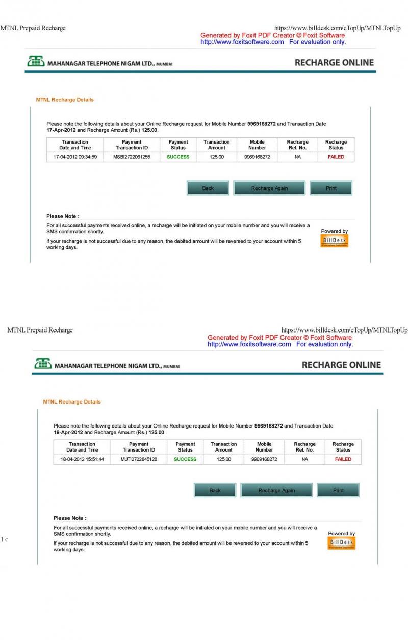 I have already sent a complaint regarding failed transaction to helpdesk.mumbai@mtnl.net.in from which i was redirected to dolphin_helpdesk@mtnl.net.in but till now i got no reply.
