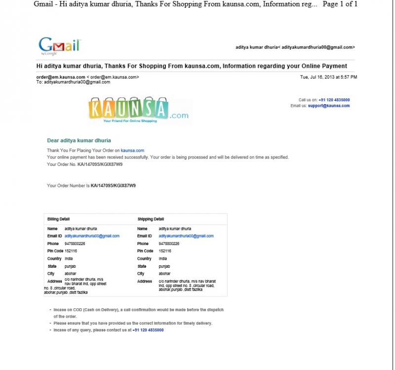 Dear Mr aditya kumar.. Is anything sorted out after you got reply from kaunsa.com website... I am the same person like you who ordered one mobile worth 18000 on July 8th and till now one month was over Kaunsa team are not delivering my product and either they are not cancelling my product,.. Can you please update me with any details...