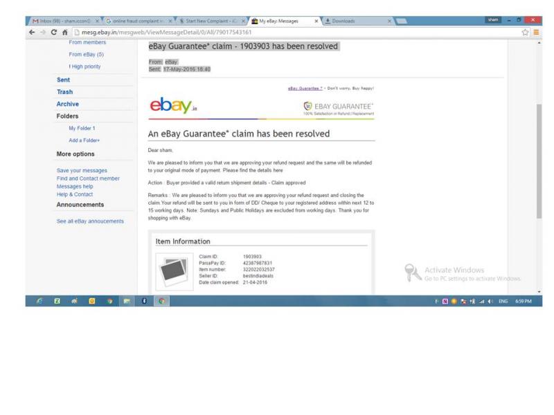 Remarks : We are pleased to inform you that we are approving your refund request and closing the claim.Your refund will be sent to you in form of DD/ Cheque to your registered address within next 12 to 15 working days. Note: Sundays and Public Holidays are excluded from working days. Thank you for shopping with eBay